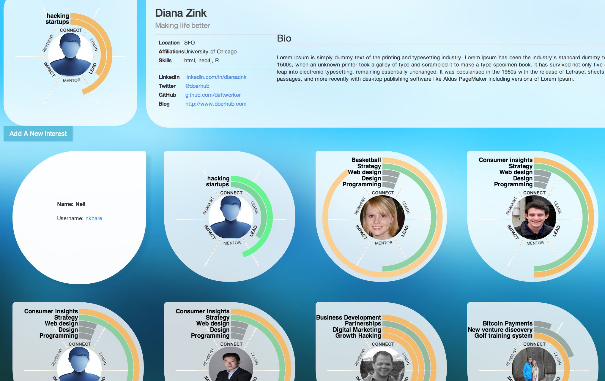 DoerHub (currently in redesign), connected people deeply interested in learning and working on even the narrowest problems within science, medicine, business or tech, to find like-minded or complementary peers. Connecting to others interested in niche topics is usually incredibly difficult geographically. However, when done online it compounds your growth and gives you peers who are just as motivated and as deeply skilled as you. We surfaced intent and helped users see complementary matches by depth and breadth of niche interests using a new visual discovery algorithm and some Natural Language Processing. From the start, DoerHub helped teams form and win funding at startup competitions. It was also successful in helping many find jobs that benefit from their niche pursuits.