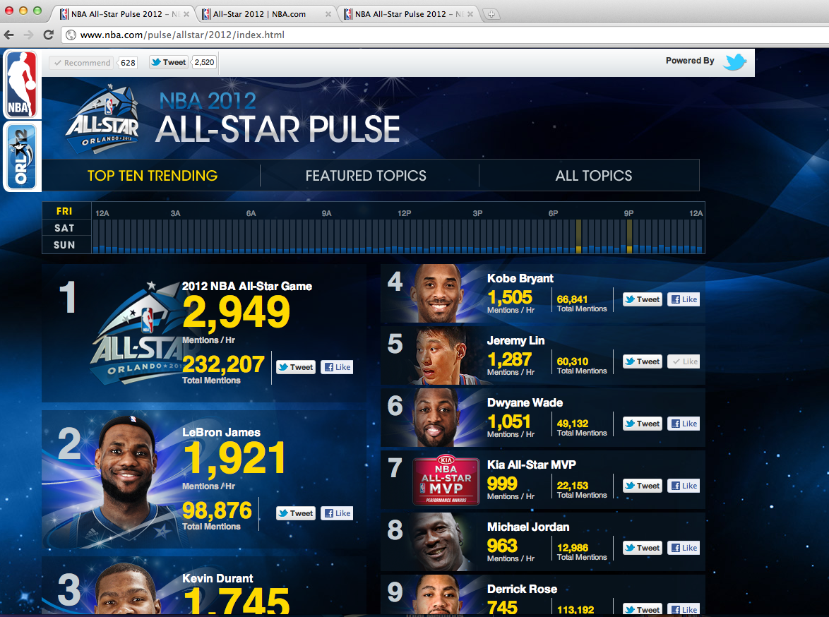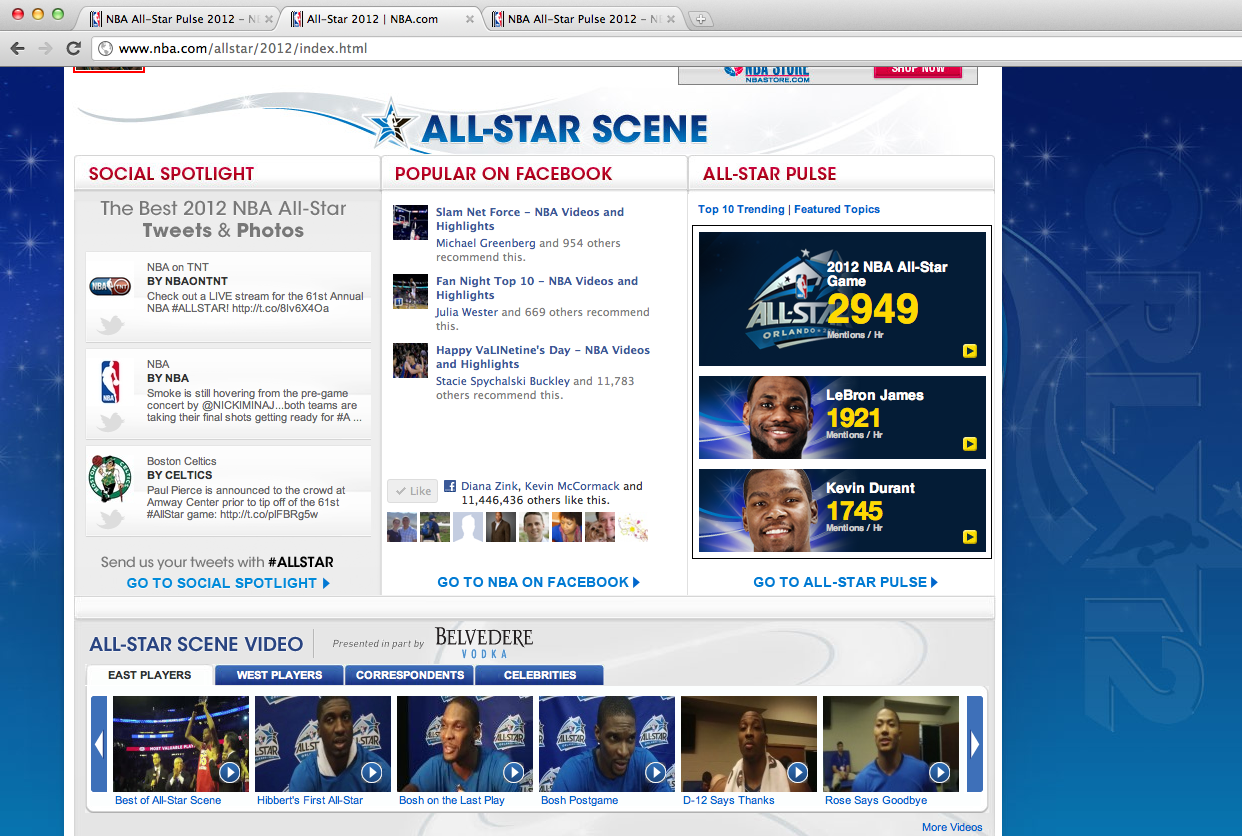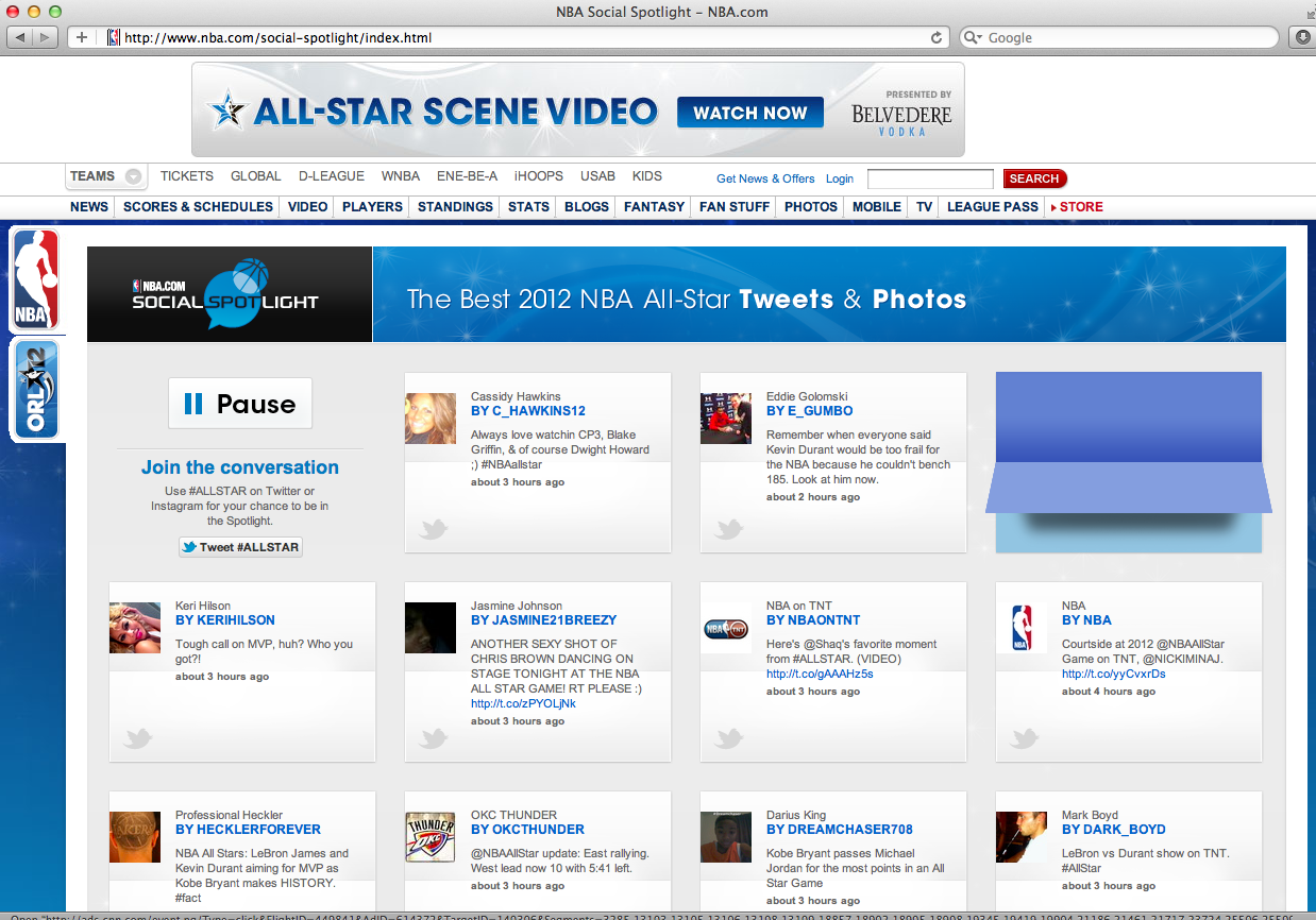 The Social Spotlight NBA.com experience I created after becoming obsessed with the mesmerizing effects effect ticker flipper displays in old airports and an art installation at Stanford GSB. The product ingested twitter feeds and had higher duration of stay than any other site experience, including the NBA Video page. It was promptly featured and sponsored from the landing page of NBA.com for years to come. In 2014 the NBA Social Spotlight won a Webby award.