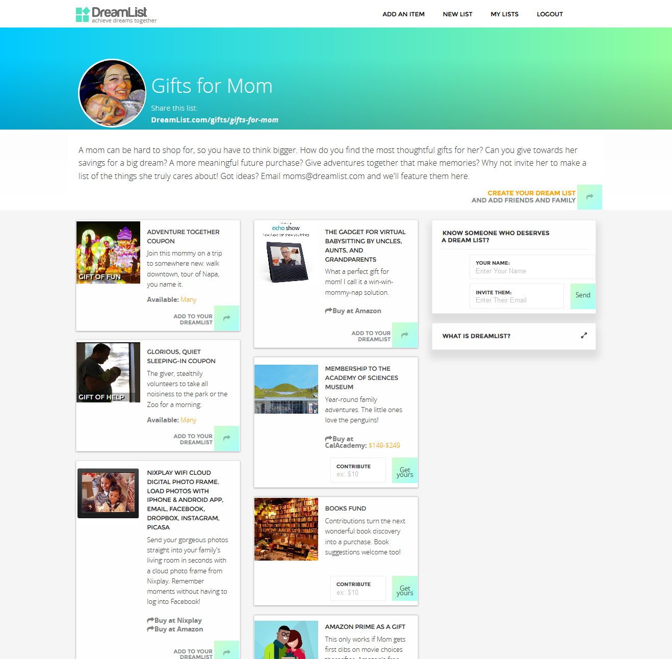 Originally, DreamList started as a new kind of online wishlist and registry. You could add not just any item from the web, as well as larger goals your family is saving towards: from classes, to museum memberships, 529 plans, a renovation, or even furniture. On special occasions friends and family could then buy or contribute towards the things that are truly meaningful to you.