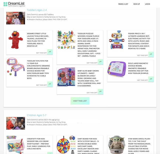 Over time we enabled multiple administrators to manage lists together, which became very handy for parents, extended families, office buyers, foundations, disaster recovery teams, schools, and even churches directing goodwill to families in need all over the world. In 2020 the site is a powerhouse for virtual gift drives done by for-profit and nonprofit organizations all over the world to make a Virtual Christmas 2020 possible despite the pandemic.